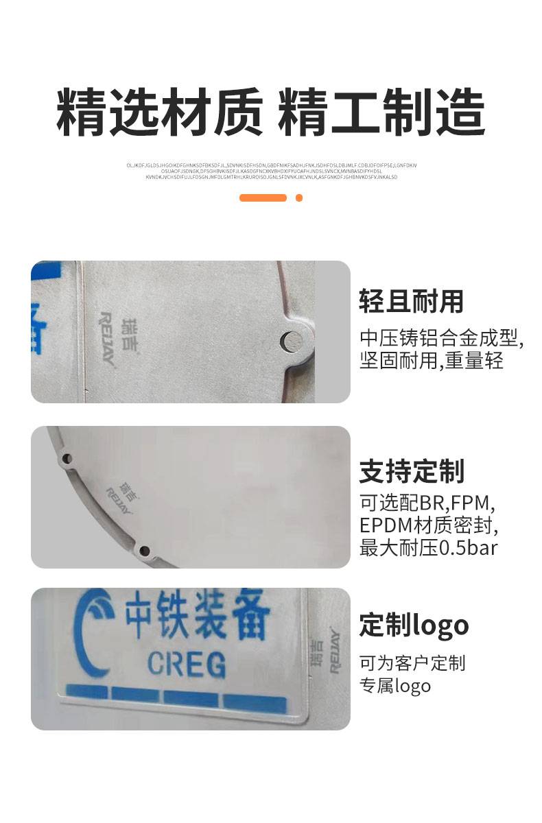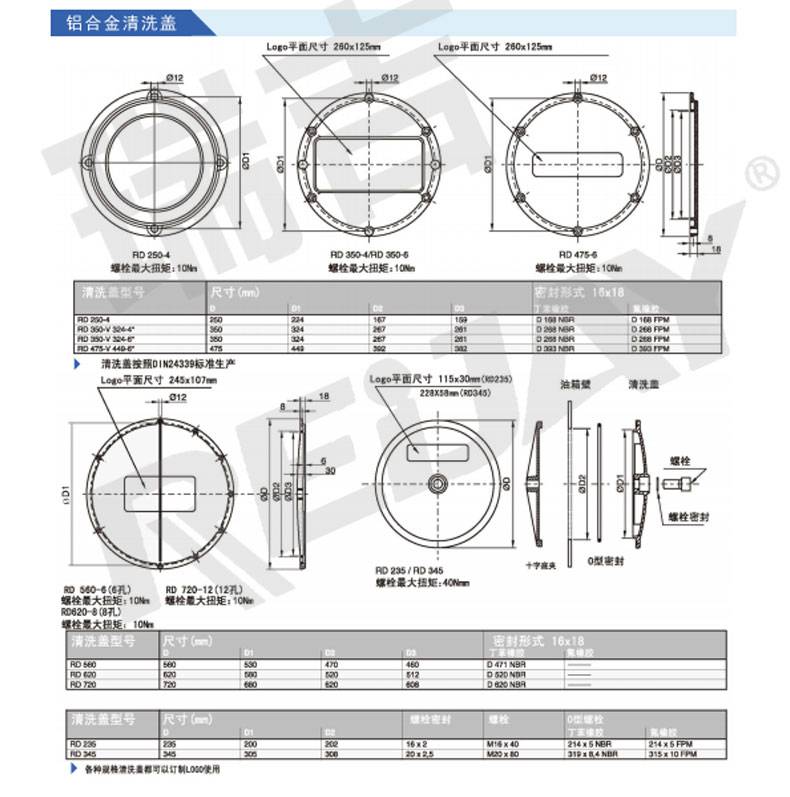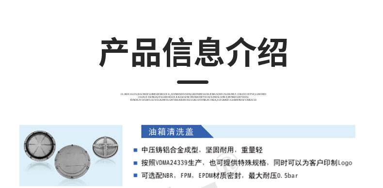 油箱盖又可以叫做清洗盖,液压用的附件之一,瑞吉REIJAY的油箱清洗盖由中压铸铝合金成型,***,重量轻。按照VDMA24339生产,也可提供特殊规格,同时也可以为客户印制LOGO。可选配NBR,FPM,EPDM材质密封,耐压0.5bar。同时也有钢制铝制可选。
